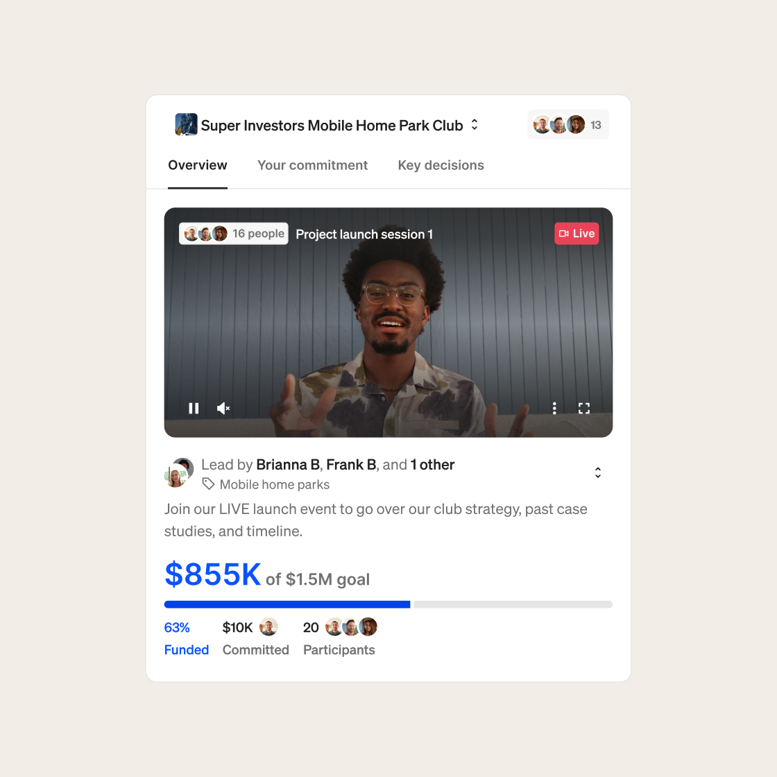 Investment clubs on Fractional let you operate efficiently as a collective. Skip the cost and red tape of syndications or funds. Pool resources with your friends, network, or audience. No middlemen. No legal headaches.